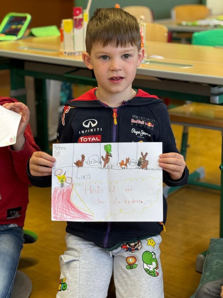 Gemeinsam wird an einer Schneegeschichte geschrieben, inspiriert vom winterlichen Geschehen draußen vor den Fenstern. Außerdem entstehen kreative „Wer bin ich?“-Geschichtenrätsel, bei denen mit viel Fantasie formuliert, gerätselt und gelacht wird.